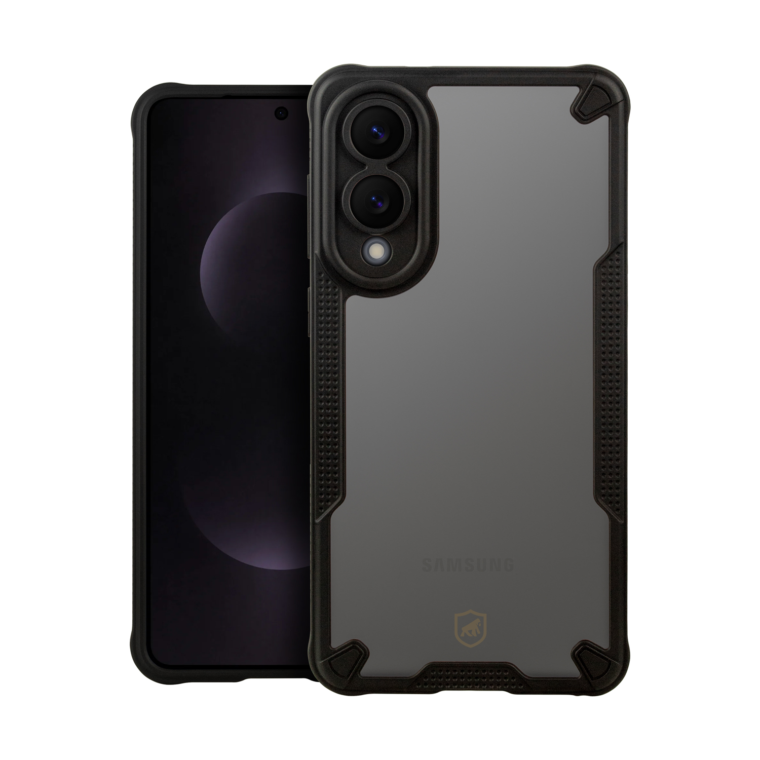 A traseira em policarbonato fosco translúcido revela discretamente o logotipo do smartphone e confere um aspecto sóbrio e elegante ao aparelho, criando um belo contraste com a moldura preta que envolve toda a estrutura. Esse acabamento também evita marcas de dedo e riscos visuais, mantendo a aparência da capa sempre limpa e sofisticada.