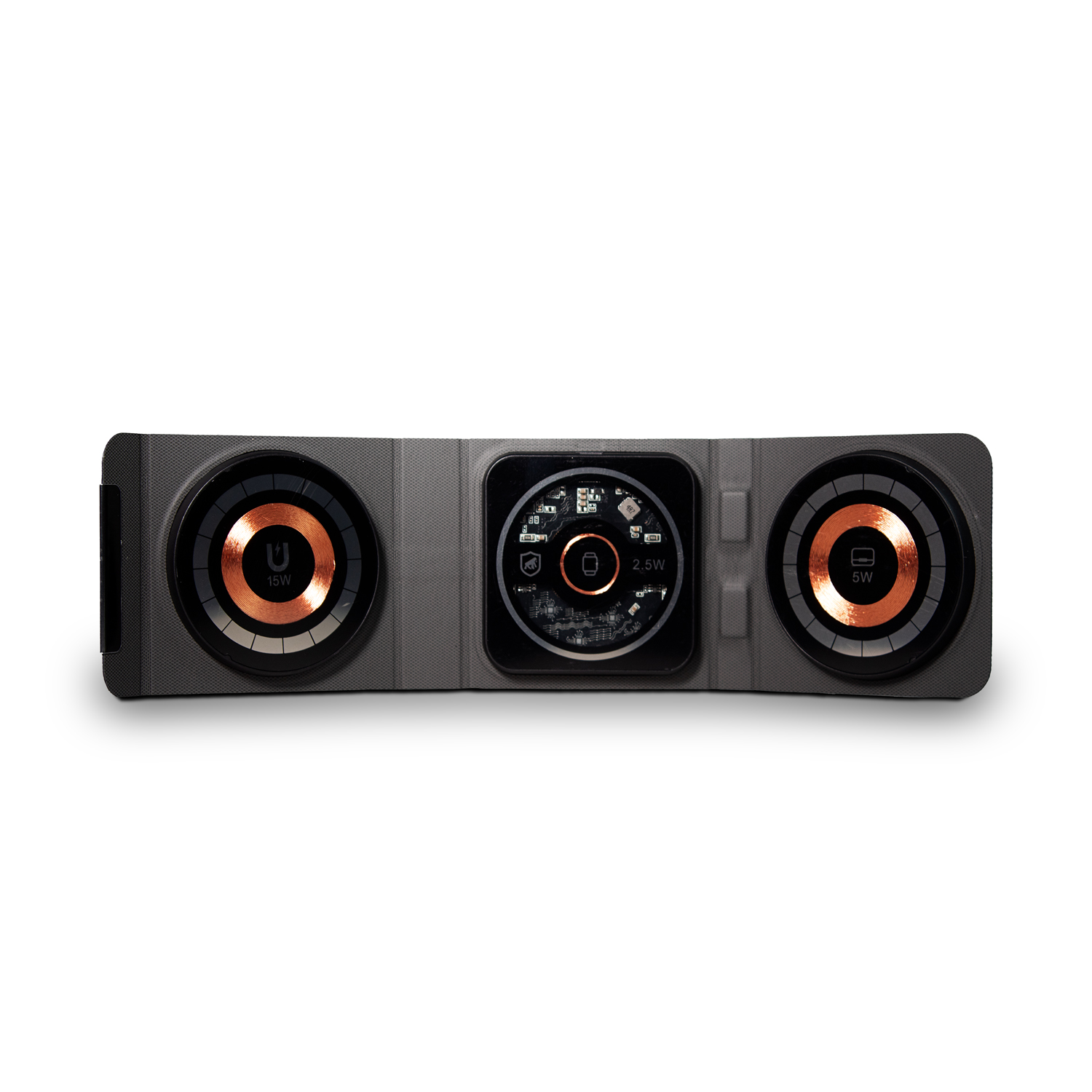 Este modelo inclui três áreas de carregamento sem fio e foi projetado para atender às necessidades específicas de diferentes dispositivos, incluindo iPhone 8 a iPhone 14, aparelhos da Samsung linhas S, Note, Fold e Flip e outros dispositivos com suporte ao carregamento sem fio Qi de todas as marcas.