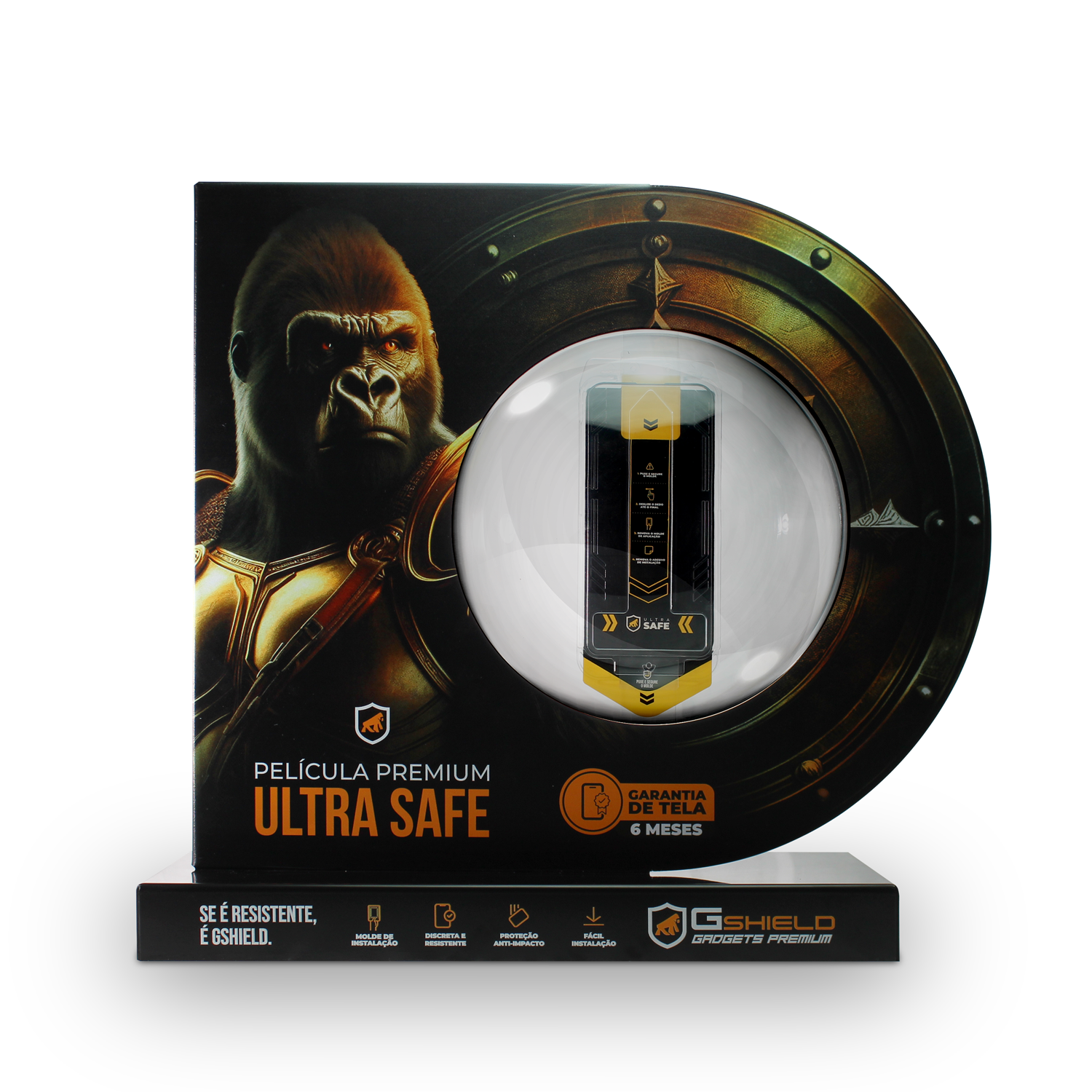 Esse display destaca os principais benefícios das películas Ultra Safe, como a proteção contra impactos, a máxima transparência e a instalação sem bolhas, esclarecendo por que essa película é a escolha ideal para proteger dispositivos móveis. O visual premium do expositor reforça ainda mais a credibilidade da marca e contribui para uma decisão de compra mais rápida e segura.